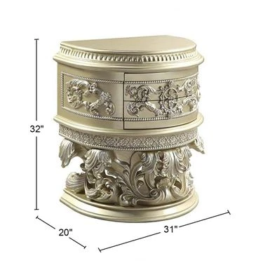 Upgrade your interior space with an essential accessory that is the perfect companion for giving your bedside or sofa a boost of refinement. Upgrade your interior space with an essential accessory that is the perfect companion for giving your bedside or sofa a boost of refinement. With a durable wood frame and finished with opulent scroll work, this nightstand offers incredible structure and stunning looks for your home. It gives your living space an incredible design with its ornate accents and two drawers for storage.