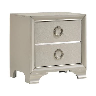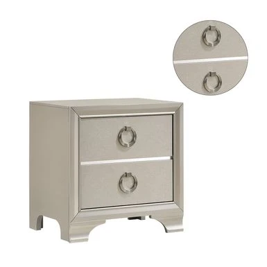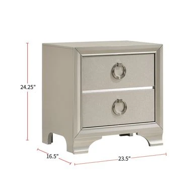 Add a touch of Hollywood glamour to your bedroom with this dazzling 2-drawer nightstand in metallic sterling. The soft, felt-lined top drawer provides a safe and stylish spot to store your jewelry and other precious items. The oversized ring handles and acrylic mirror accents add a touch of sophistication to its sleek design. With its transitional style, this nightstand is the perfect piece to elevate any bedroom décor.