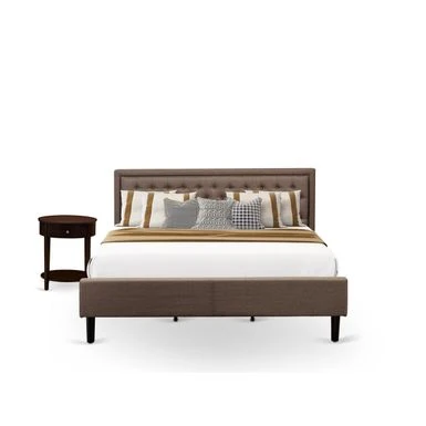 2 Piece Bed Set – 1 Full Size Bed Brown Linen Fabric Padded and Button Tufted Headboard – 1 Night Stand for Bedroom with Mid Century Drawer – Black Finish Legs