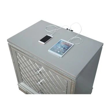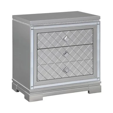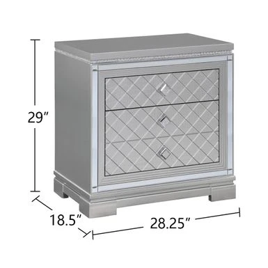 A bright and cheerful design is sure to add fame and fortune to your glamorous bedroom decor. This item features mirror trim accents and grid-patterned front panels in a glowing silver metallic finish. A bright and cheerful design is sure to add fame and fortune to your glamorous bedroom decor. This item features mirror trim accents and grid-patterned front panels in a glowing silver metallic finish. Diamond-shaped, croc-embossed front panels make the item more fashionable. Mirrored strips reflect elegance.