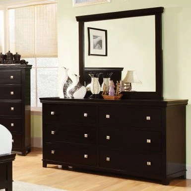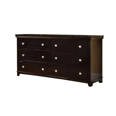 The dresser showcase the exemplary features of a contemporary style. It has six drawers with nickel square knob which provide enough storage space. The dresser showcase the exemplary features of a contemporary style. It has six drawers with nickel square knob which provide enough storage space. With the smooth brown cherry finish of the solid woods and veneer adds to the updated design, this dresser will perfect for complementing any bedroom space.