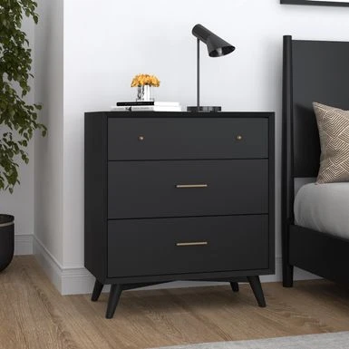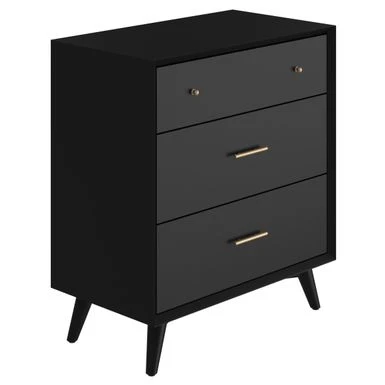 The Flynn collection features the classic lines of Mid-Century Modern furniture that never goes out of style. Its sturdy frames are built to last, constructed of sustainably sourced solid Mahogany to ensure a lifetime of use. The Flynn collection features the classic lines of Mid-Century Modern furniture that never goes out of style. Its sturdy frames are built to last, constructed of sustainably sourced solid Mahogany to ensure a lifetime of use. The case pieces provide a roomy storage solution and make it easy to create a cohesive decorating style or mix and match for a more personalized look. The Flynn small chest provides additional storage to your bedroom décor. Features 3 drawers for storage and felt lined top drawer for your valuables. The Flynn collection offers multiple finish options to mix and match for all your décor needs.