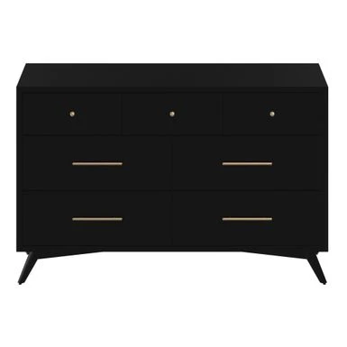 Introducing the Alpine Furniture Flynn Mid Century Modern 7 Drawer Dresser in Black – a timeless addition to your bedroom. Built to last, this dresser is constructed with sustainably sourced solid Mahogany, ensuring longevity. The classic lines of the Mid-Century Modern design never go out of style and make it easy to create a cohesive decorating style. With seven roomy drawers, including felt lined top drawers for your valuables, this dresser provides ample storage space. Choose from multiple finish options to match your decor needs.