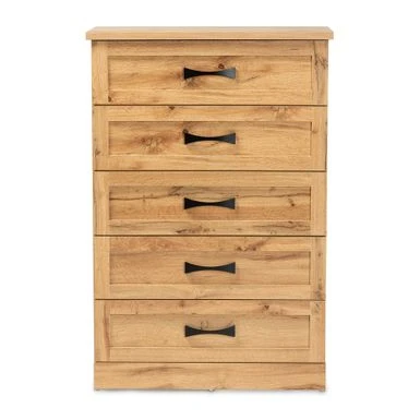 Organize your clothes and bedding with the Colburn chest. Made in Malaysia, its natural oak brown color palette and classic-tallboy design exudes a refined attitude into your space. Organize your clothes and bedding with the Colburn chest. Made in Malaysia, its natural oak brown color palette and classic-tallboy design exudes a refined attitude into your space. This sturdy piece is constructed from high-density engineered wood boards for long-lasting strength along with quality runners for smooth functionality. Requiring assembly, the Colburn features five large drawers to efficiently organize any space. Metal drawer handles add a sleek, contemporary touch, characterizing the Colburn storage chest as a sophisticated solution to modern bedroom storage. .. Constructed from engineered wood and metal Style: modern Materials: mdf, metal Color: oak brown Oak brown finish Five (5) drawers Black finished metal handles Anti-topple kit included Includes: one (1) chest Assembly: assembly required Care instruction: wipe clean Dimensions: 46.4″ high x 31.5″ wide x 15.75″ deep Drawer dimensions: 5.75″ high x 26.97″ wide x 12.56″ deep Product weight: 74.6 lbs.