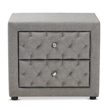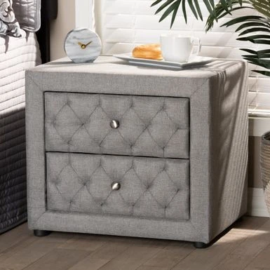 Soft upholstery and chic tufting make the Lepine nightstand a stylish addition to any bedside. Constructed from wood, the Lepine is upholstered in a resilient, neutral polyester fabric and padded with foam for a cozy feel. Soft upholstery and chic tufting make the Lepine nightstand a stylish addition to any bedside. Constructed from wood, the Lepine is upholstered in a resilient, neutral polyester fabric and padded with foam for a cozy feel. Two drawers, adorned with silver metal knobs, provide storage space for headphones, lotion, and more. Modern and contemporary nightstand Style: contemporary Materials: fabric linen “polyester 100%”, rubberwood, foam Color: gray, light beige Constructed from plywood and MDF wood Polyester fabric upholstery with foam padding Two (2) drawers Black plastic legs Includes: one (1) nightstand Assembly: assembly required Care instruction: spot clean Overall: 19.9 inches high x 22.4 inches wide x 17.1 inches deep Drawer: 4.25 inches high x 15.25 inches wide x 13 inches deep Legs: 1 inches high Product weight: 34 lbs.