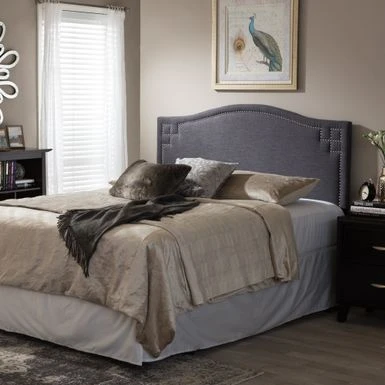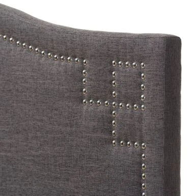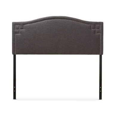 Transform your bedroom into a refined and cozy retreat with the Copper Grove Daisy Modern Dark Grey Upholstered Headboard. Crafted from solid rubberwood and plywood, this camelback headboard is elegantly upholstered in dark grey polyester fabric, exuding timeless sophistication. Its height-adjustable design features gleaming silvertone nailhead trim and geometric detailing that adds a touch of charm to your space.