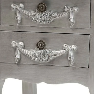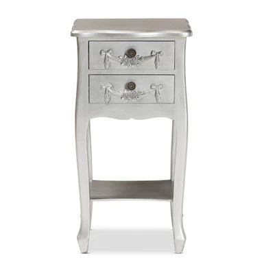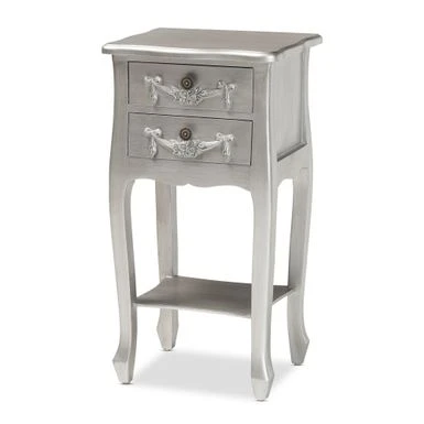 Uplift your daily routine with the timeless style of the Eliya end table. Made in China, this exquisite piece is comprised of a solid wood frame embellished with metal drawer knobs. Uplift your daily routine with the timeless style of the Eliya end table. Made in China, this exquisite piece is comprised of a solid wood frame embellished with metal drawer knobs. Two drawers provide space to organize space essentials, while the open shelf serves as a convenient display for larger items. The Eliya will arrive fully assembled and features cabriole legs for excellent stability and support in elegant style. Floral moldings add a graceful touch, making the Eliya end table an enchanting addition to any living room. Metal drawer knobs Style: Traditional Materials: MDF, Metal, Fir Wood Color: Silver Constructed from MDF and Firwood Two (2) drawers Open shelf Floral molding Includes: One (1) end table Assembly: Assembled Care instruction: Wipe Clean Overall dimensions: 29.50″ high x 15.70″ wide x 13.70″ deep Drawer(each): 10.60″ wide x 9.80″ deep x 3.50″ high Open shelf: 11.50″ wide x 9.00″ deep x 11.25″ high Legs: 6.70″ high Product weight: 13.2 lbs.
