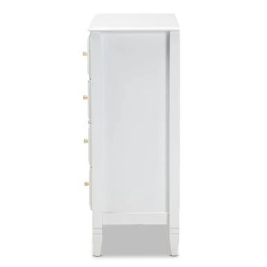 A classic silhouette receives a glamorous update in the Naomi chest. Made in Malaysia, this wooden chest displays a polished white finish that brightens any space. A classic silhouette receives a glamorous update in the Naomi chest. Made in Malaysia, this wooden chest displays a polished white finish that brightens any space. The tabletop is well suited for a lamp and trinkets, while four drawers provide ample storage space for clothing and linens. Each drawer is adorned with a striking gold-tone knob that adds a touch of glamour. Inspired by traditional design, the Naomi features tapered feet with recessed detailing. Requiring assembly, the Naomi chest strikes the optimal balance between classic and contemporary for a look that enhances any bedroom. . Classic and transitional chest Style: transitional Materials: rubberwood, mdf, metal Color: white, gold Constructed from solid rubberwood and MDF wood White finish Four (4) drawers Round gold-tone metal knobs Includes: one (1) chest Assembly: assembly required Care instruction: wipe clean Dimensions: 40.6″ high x 31.5″ wide x 15.7″ deep Drawer dimensions: 5.8″ high x 25.2″ wide x 13.6″ deep Legs: 40″ high Product weight: 102.3 lbs.