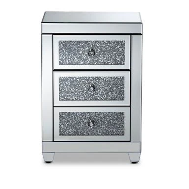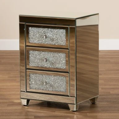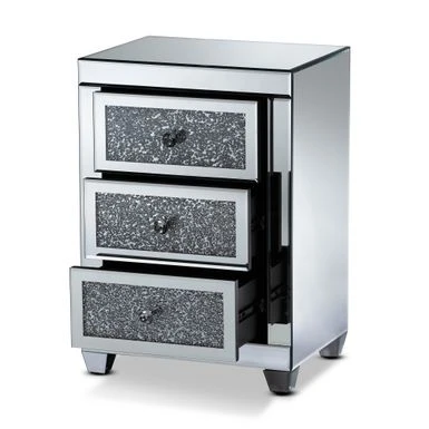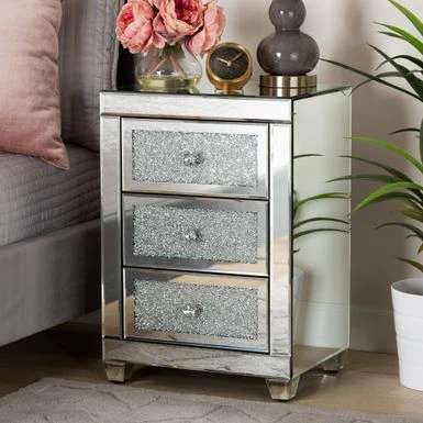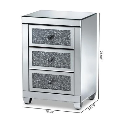 Accent your living room with the elegant style of the Ralston end table. Made in China, the Ralston is comprised of a wood frame fitted with mirrored glass for a graceful style that adds beauty to any space. Accent your living room with the elegant style of the Ralston end table. Made in China, the Ralston is comprised of a wood frame fitted with mirrored glass for a graceful style that adds beauty to any space. Three spacious drawers are embedded with stunning floating crystals that easily catch and reflect light. Fully assembled, the end table also features crystal drawer knobs for added glamour. An eye-catching design that efficiently organizes all your essentials, the Ralston end table is an exceptional addition to any home… Constructed from MDF wood and mirrored glass Style: modern Materials: mdf, mirror Color: mirrored, sliver Three (3) drawers Floating crystal drawer fronts Crystal drawer knobs Tapered feet Includes: one (1) end table Assembly: assembled Care instruction: wipe clean Overall dimensions: 26″ high x 18″ wide x 14″ deep Legs: 2″ high Drawers: 12.25″ wx 11″ d x 4.5″ h Product weight: 70.5 lbs.
