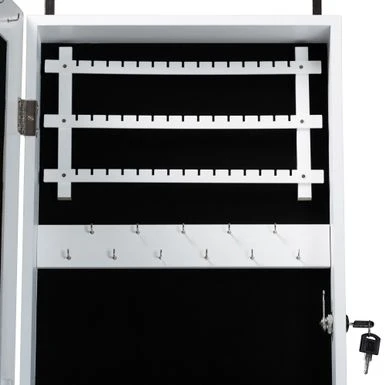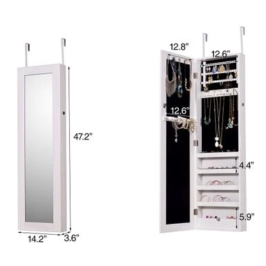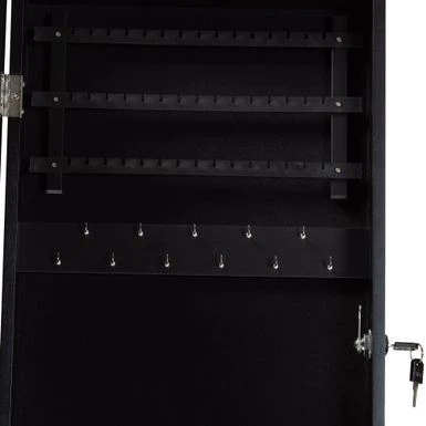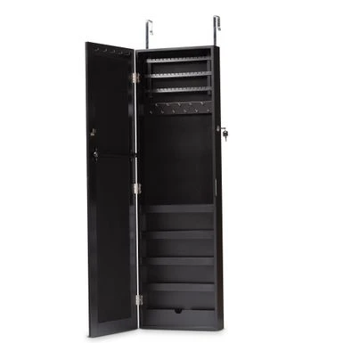 Discreetly arrange your jewelry all in one place with the elegant versatility of the Richelle jewelry armoire. Made in China, this armoire is constructed from sturdy wood. Discreetly arrange your jewelry all in one place with the elegant versatility of the Richelle jewelry armoire. Made in China, this armoire is constructed from sturdy wood. The door features a secure lock that opens to reveal necklace and bracelet hooks, three shelves, ring compression folds, earring holders, and one hanger rod. Requiring assembly, the Richelle can either be hung over the door, or mounted to the wall, to maximize floor space while providing convenient jewelry storage. A seamless and effective solution to your storage needs, the Richelle jewelry armoire gracefully organizes your collection… Mirrored glass front Style: modern Materials: mdf, metal, foam Color: Black Constructed from engineered wood Your choice: hang over the door, or mount on the wall Hanging/mounting hardware included Capacity: 16 necklace and bracelet hooks, 45 earring holders, and one hanger rod Includes: one (1) jewelry armoire Assembly: Assembly Required Care instruction: wipe clean Overall dimensions: 47.30″ high x 14.20″ wide x 3.60″ deep Storage behind door dimensions: 13.10″ wide x 2.80″ deep x 33.70″ high Product weight: 19 lbs.