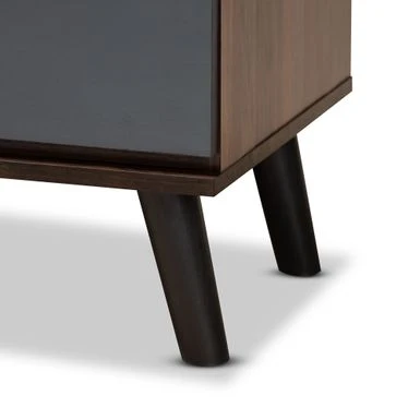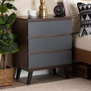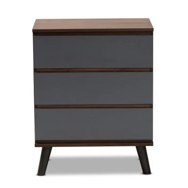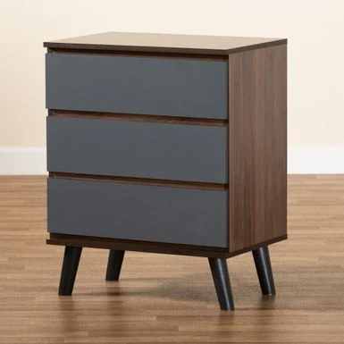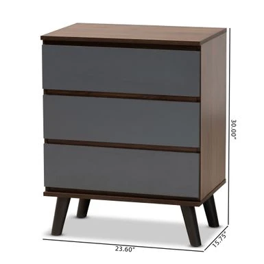 Sleek design with clean wood lines distinguish the Roldan chest as a fantastic addition to any space. Made in Malaysia, the Roldan is comprised of sturdy wood showcasing a two-tone finish of walnut brown and grey. Sleek design with clean wood lines distinguish the Roldan chest as a fantastic addition to any space. Made in Malaysia, the Roldan is comprised of sturdy wood showcasing a two-tone finish of walnut brown and grey. Three spacious drawers provide ample storage for clothes, linens, and other various items. Requiring assembly, the Roldan is supported by black angled legs for excellent stability while also lending a touch of mid-century charm. With a stunning design and outstanding storage capability, the Roldan chest updates any space… Modern and contemporary chest Style: modern Materials: mdf, pvc Color: grey, walnut brown, black Constructed from engineered wood Two-tone walnut brown and grey finish Three (3) drawers Black finished polymer legs Includes: one (1) chest Assembly: assembly required Care instruction: wipe clean Dimensions: 29.9″ high x 23.6″ wide x 15.7″deep Large drawers: 4″ high x 20.1″ wide x 12.5″ deep Legs: 6.2″ high Product weight: 59.5 lbs.