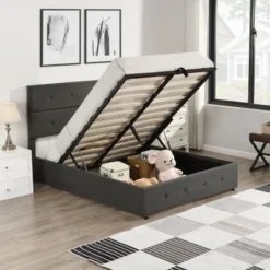 Nestfair Upholstered Platform Bed With Underneath Storage – Grey – Queen