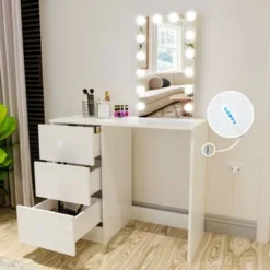 Boahaus Freya White 7-drawer Vanity Dressing Table With Lighted Mirror – White-Gold Knobs