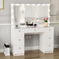 Boahaus Yara Lighted Vanity With Glass Top (White) – White-Gold Knobs