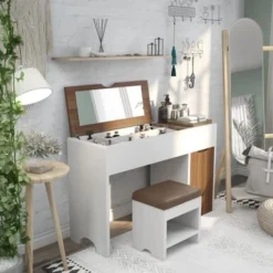 Roundhill Furniture Copper Grove Watt Wood Makeup Vanity Table And Stool Set – White