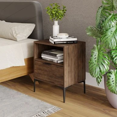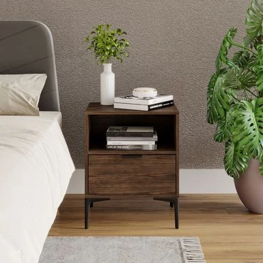 Add a touch of industrial style to your bedroom with this rustic 1-drawer nightstand. The spacious drawer includes an extra shelf for storage or display, and slides on ball bearings for easy access. The metal hardware pull adds a premium touch, while the “L” shaped legs provide durability and stability. With a charcoal or penny bronze walnut finish, this affordable and practical nightstand is perfect for any room in your home.