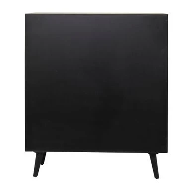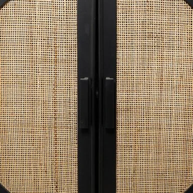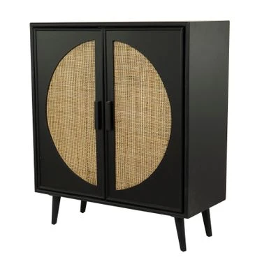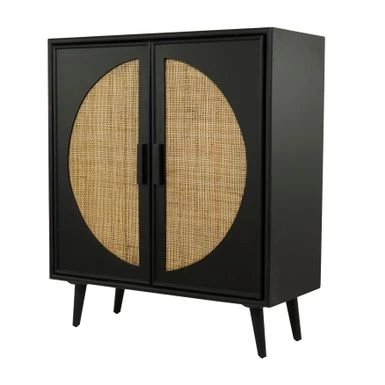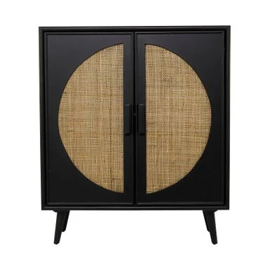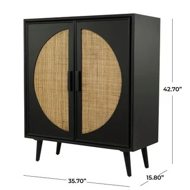 - A 2-door decorative cabinet highlighting a black square wooden structure with 2 semicircle brown woven front design with rectangular handles for easy use, 4 splayed sturdy legs, and spacious inner storage with a shelf that divides the cabinet into 2 parts