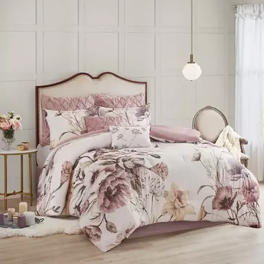 - Set includes 1 comforter, 2 euro shams, 2 matching shams, 3 decorative pillows and 1 bed skirt