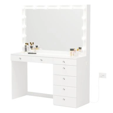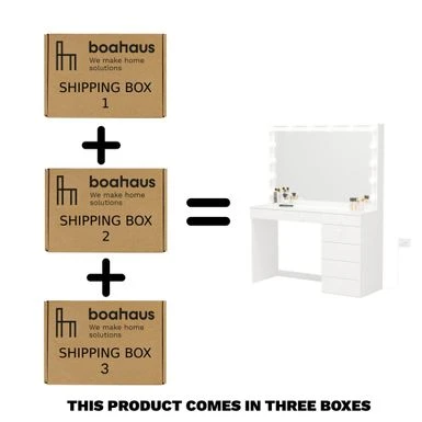 Get ready to feel like a Hollywood star with the Boahaus Diana Dressing Table. This stunning vanity boasts a modern and clean design that will elevate the style of your bedroom. Crafted with high-quality manufactured wood and melamine veneer, it features a symmetrical silhouette and seven spacious drawers to keep all your day-to-day essentials organized and secure. The large desk top provides ample space for your laptop, souvenirs, and makeup essentials, while the wide mirror with dimmable Hollywood-style light bulbs creates the perfect lighting for applying makeup or hairstyling. With customizable lighting and a leg space of 25” H x 30” W x 18” D, this vanity is the perfect addition to any bedroom.
