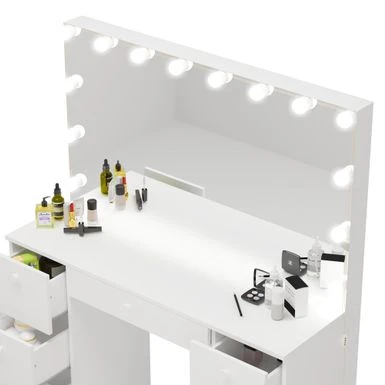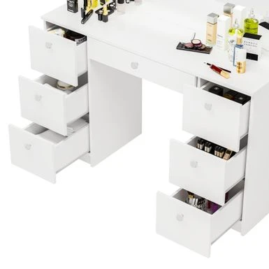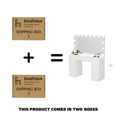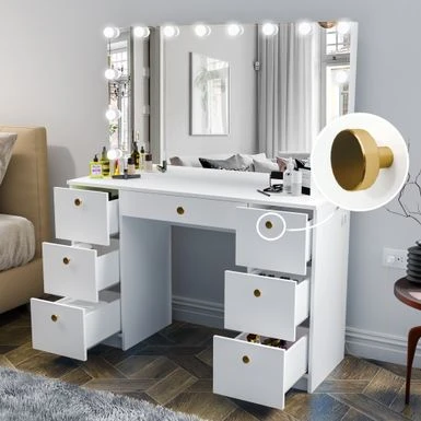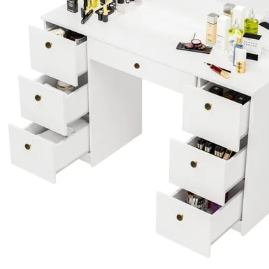 Boahaus Freya White 7-drawer Vanity Dressing Table With Lighted Mirror – White-Gold Knobs