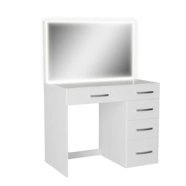 Upgrade your makeup routine with the Boahaus Gaia Lighted Vanity. This exceptional dressing table features an all-wide mirror for the best view while applying makeup or doing your hair. With a central drawer and four lateral drawers, you can easily find and store all of your important makeup gadgets. Made from manufactured wood with laminate veneers, this vanity is both sturdy and stylish. Assembly is required. Please note that the LED light strip is not built-in and must be added separately. Measures 54″ H x 38″ W x 15″ D.