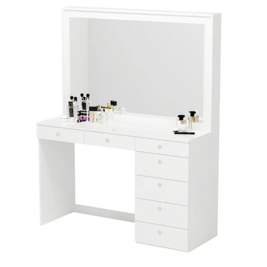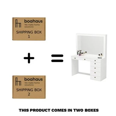 Get ready like a Hollywood star with the Boahaus Modern Vanity Table. This sleek and contemporary dressing table adds a touch of glamour to your bedroom decor. Crafted from engineered wood with a white finish, this vanity boasts a symmetrical design. It features an impressive seven drawers, providing ample space to keep your jewelry, documents, and daily essentials organized and secure. The spacious top desk is perfect for displaying your favorite mementos, working on your laptop, and admiring your reflection in the wide panel mirror. Measures 57.88 H x 47.25 W x 18.31 D.