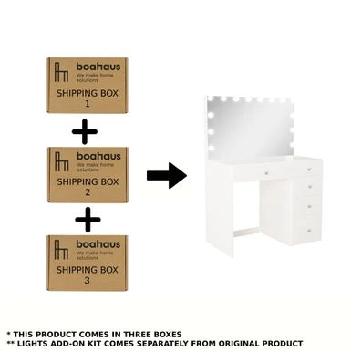 Get ready for your day with the Boahaus Saranya Makeup Vanity. This high-quality dressing table features plenty of storage space and a sleek, stylish design. You’ll love the all-wide mirror that allows you to view yourself in the best way possible while putting on makeup or doing your hair. The central drawer and four lateral drawers provide ample space to store all your makeup gadgets and beauty essentials. Made from manufactured wood with laminate veneers, this vanity measures 54″ H x 38″ W x 15″ D and requires assembly. Note that light bulbs are not built-in, but can be added on separately for a glamorous touch.