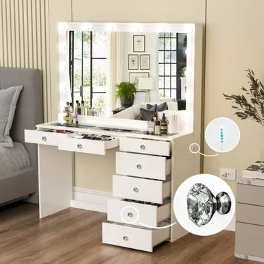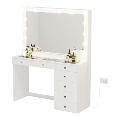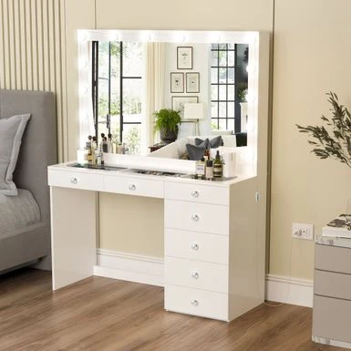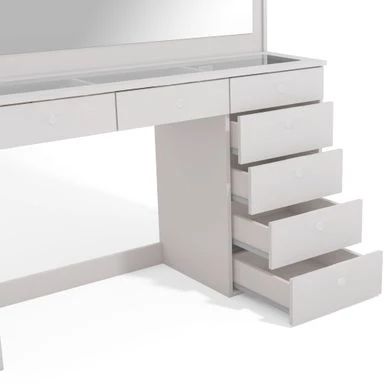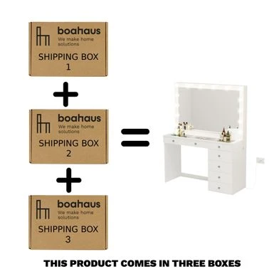 Get ready like a Hollywood star with the Boahaus Serena Lighted Vanity. Its clean and modern design made with manufactured wood provides a symmetrical silhouette. The glass top desk and wide mirror create an impressive look that will add glamour to your bedroom. With seven spacious drawers, you can keep all your essentials organized and safe. The Hollywood light bulbs with customizable lighting make it perfect for makeup application and hairstyling. Also, the glass top desk is perfect for working on your laptop. Measures 58.20″ H x 47.30″ W x 16.90″ D. LIGHT BULBS ARE NOT BUILT IN. IT IS AN ADD ON.
