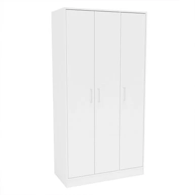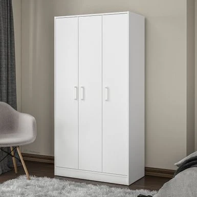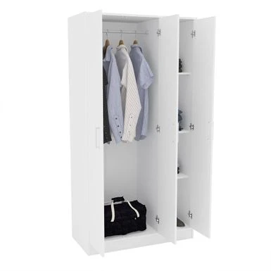 Upgrade your bedroom with the sleek and modern Boahaus Siegen Armoire in white finish. Constructed with manufactured wood and a durable melamine coating to resist stains and scratches, this 3-door armoire blends form and function seamlessly. The left two-door cabinet features a crossbar for hanging clothes, while the right door opens to reveal four shelves for organizing shoes, purses, or other accessories. With a minimalist design, this mid-century modern style armoire is the perfect addition to any bedroom. Assembly required.