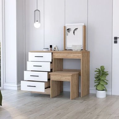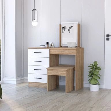 Get ready in style with the Boahaus Tyche Dressing Table in White-Brown. This elegant and practical piece is a must-have for your beauty routine. With four spacious drawers (13.1”D x 18.5”W x 3.9”H) and a roomy top surface (39.37”W x 16.73”D) that includes a mirror (19.4”H x 11.8”W), you’ll have plenty of space to store and organize all of your cosmetics and accessories. Plus, the included stool (16.2”H x 13.3”W x 14.9”D) ensures you’ll be comfortable while getting ready. Made of high-quality pine-white particleboard finish, this dressing table is both beautiful and durable.