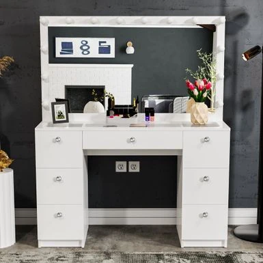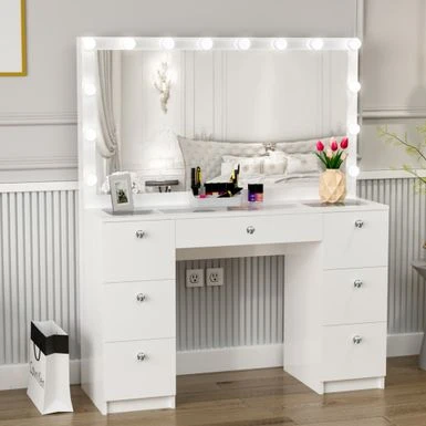 Boahaus Yara Lighted Vanity With Glass Top (White) – White-Gold Knobs