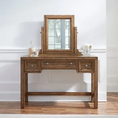Add a touch of contemporary charm to your living space with this Carbon Loft Wallace Vanity and Mirror. The aged toffee colored finish gives it a rustic look, while the mahogany solids and cherry veneer over engineered wood construction make it sturdy and durable. The drawers feature removable felt lined jewelry holders and antique nickel finished pulls, ensuring ample storage space. The carved turned legs add to its elegance. The mirror is made of solid mahogany with molded frame and beveled mirror glass, and can be adjusted up and down. Please note that the finish and measurements may vary slightly, and assembly is required.