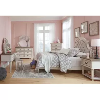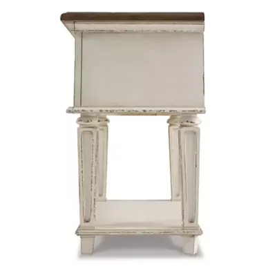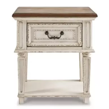 Elevating the art of traditional cottage styling, the Realyn nightstand is your dream bedroom retreat realized. Antiqued two-tone aesthetic blends a chipped white with a distressed wood finished top for added charm. Adorned with classic bail pull hardware, the smooth-gliding drawer is crafted with quality dovetail construction for years of satisfaction.