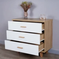 The Clihome Three Drawer Storage Cabinet Bedside Table is a versatile solution for all your storage needs. Ideal for small spaces such as dorm rooms and apartments, this multi-purpose drawer chest can be used in various settings, such as living rooms, bedrooms, nurseries, and offices. It features a mid-century modern design with a wood grain finish in warm white, adding a touch of elegance to any room. Moreover, the top panel is made of 25mm thickness particle board, making it more stable and durable than other similar products. With a large storage space design, this drawer dresser can easily accommodate clothing, toys, magazines, red wine, and more. The smooth guides allow drawers to be pulled out and closed quietly and easily. The Clihome Three Drawer Storage Cabinet Bedside Table can bear up to 220 pounds, making it an excellent storage solution for various occasions.