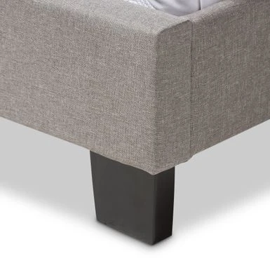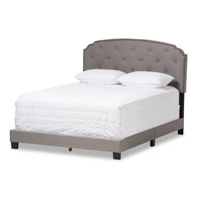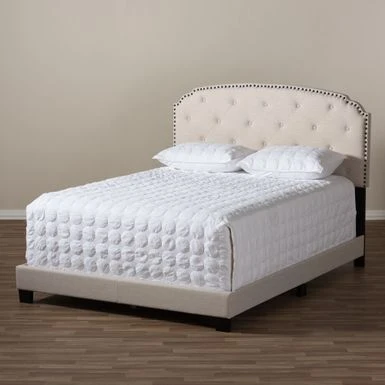 Magnificently crafted from rubberwood, MDF, and particle board, this trendy Brentwood bed from Copper Grove will refresh the style of your room. The elegant bed set includes an upholstered base, and an arched and scalloped headboard with diamond button tufting and nailhead trim. The sophisticated bed comes in full, queen, or king size, with polyester fabric upholstery, available in light beige and light grey.