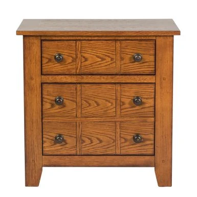 Staple any room with this rustic American style night stand. Constructed with select hardwoods and ash and oak veneers, this piece features an aged oak finish, complete dust proofing and antique brass knob hardware. With wood and peg accents, this night stand is sure to bring uniqueness and functionality to any room.