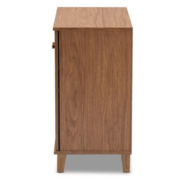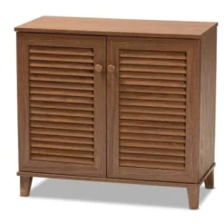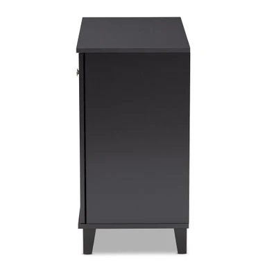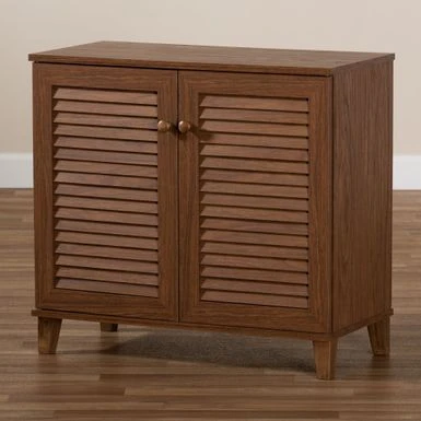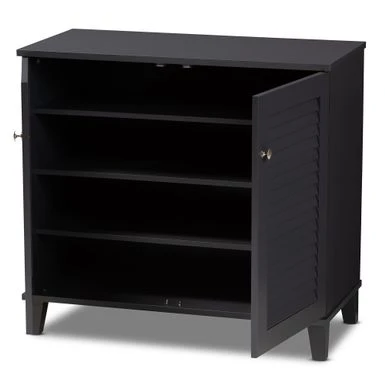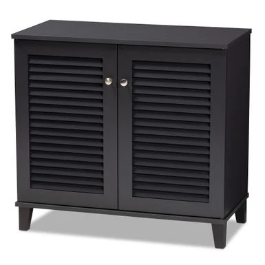 Use this freestanding contemporary cabinet to organize shoes in your bedroom, mud room, or front foyer. The four shelves hold up to 12 pairs of shoes that are decoratively concealed behind two slatted doors. Use this freestanding contemporary cabinet to organize shoes in your bedroom, mud room, or front foyer. The four shelves hold up to 12 pairs of shoes that are decoratively concealed behind two slatted doors.
