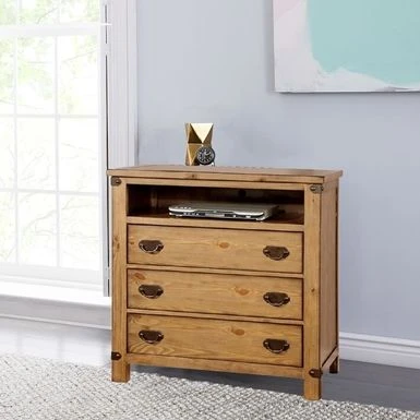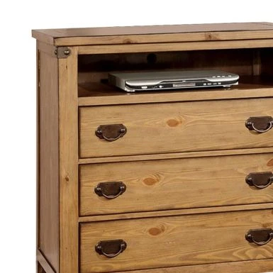 Add charm to your entertainment space with this Wooden Media Chest. Constructed with high-quality wood and veneer, this cottage style chest features a natural brown finish that effortlessly complements all types of decor. It boasts an open shelf with a back hole for easy wiring and three spacious drawers with antique metal handles that offer ample storage space for your media accessories or other essentials. The chest is also supported by sturdy wooden block feet, making it a durable addition to your home.