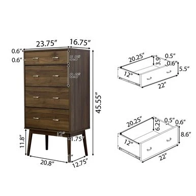 - 4 Drawer Dresser Dimensions: 16.75 inches deep x 23.75 inches wide x 45.55 inches high