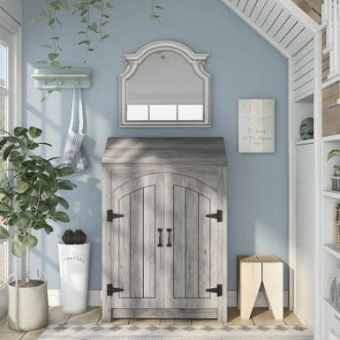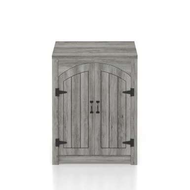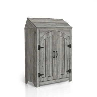 - Saloon-style double-doors with black bar handles and hinge accents