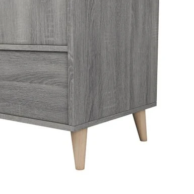 - Distressed grey finish and natural-finish wood legs
