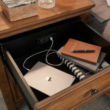 - Built-in: two (2) electric outlets and two (2) USB ports in top drawer