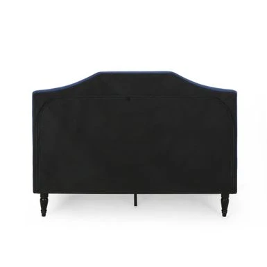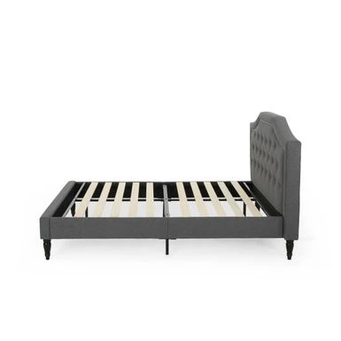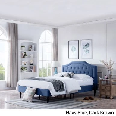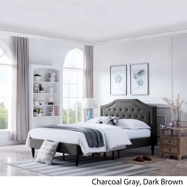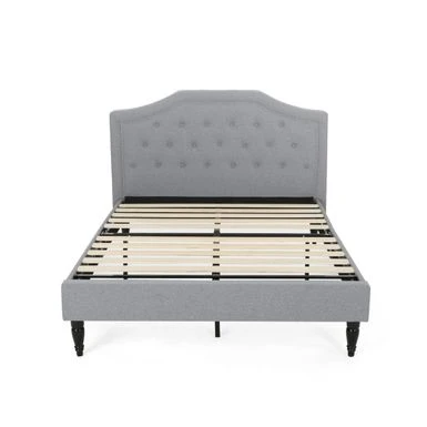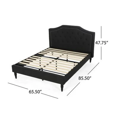 Sleep comfortably with this upholstered queen sized platform bed. The wooden frame features a classic camelback silhouette, detailed with button tufting and nailhead trim. Choose from four polyester upholstery colors to complement your existing decor.
