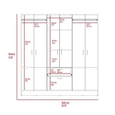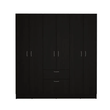 Do you need a place to store all of your clothes? say no more; This 6-door armoire is what you are looking for., This unit has eight spots to organize your items into perfectly. You will have two cabinets, each one with an interior hanging rod that will allow you to hang your shirts, suits, pants, or dresses. Three spots in the middle to store different items such as folded clothing, books, purses, or just for personal use; at the bottom, you will find a fold door and one easy-to-access sliding drawer. Made of engineered wood particle board with a Wenge finish. Available in Black or White.