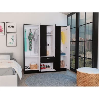 - Featuring a 2-door cabinet with a hanging rod for those wrinkle-prone clothing, like dresses, and suits with shelves on both sides. The middle cabinet has 3 shelves to keep your folded items, a drawer underneath, and a pull-down door cabinet to keep your clothing concealed, neat and organized