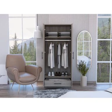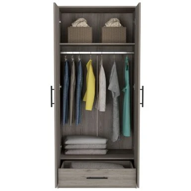 This elegant armoire features a laminated finish and is available in your choice of light grey or white. Equipped with double doors that easily open to a spacious wardrobe, the inside includes a top shelf that can be used to store clothing, bed sheets, books, and other daily essentials. Below the top shelf, you’ll find a sturdy closet rod that is ideal for hanging clothing and outerwear. A convenient bracket is located at the bottom of this piece and is ideal for storing shoes. Lastly, this armoire comes with a large 4.9″ tall drawer that is suitable for storing bigger items. Rest assured that this armoire will add a clean and functional touch to any living room, bedroom, or guest room.