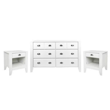 Keep your clothes organized and manage your bedside clutter with a bedroom set of stylish caliber. Our outstanding three-piece set offers a six-drawer double dresser and two nightstands, created for both functionality and impeccable style. This set effortlessly brings a contemporary look to any space with its classic aesthetics. Complete with plenty of drawers for ample storage space, this impressive bedroom set provides all sorts of options to remove clutter to keep your bedroom in a state of absolute refinement.