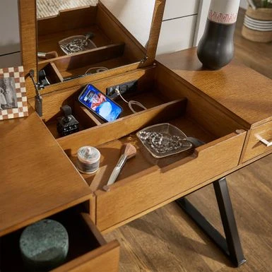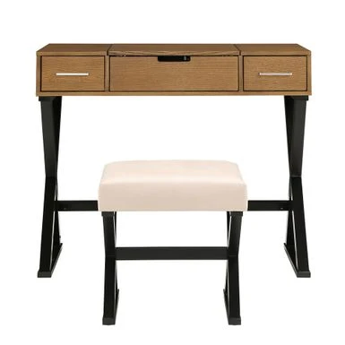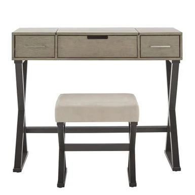 Flip up the mirror of this vanity while you get made up each morning. This piece features a mirrored flip-top compartment with power strip and USB charging station. It is also constructed with two drawers and has a grey-finished acacia wood on bold, black X-shape legs. The included plush, microfiber stool offers a comfortable place to sit.