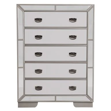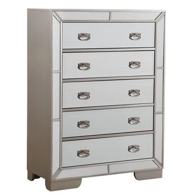 The Hollywood Hills Mirrored Chest by Glory Furniture is a unique addition to your bedroom decor. The chest is made with wood veneers over manufactured and solid wood and the piece features a beautiful, glass mirrored front. The drawers are constructed with ball-bearing, full-extension drawer glides and has English dovetails for even more durability. The drawers have corner blocks for supporting the drawer bottoms. The piece is fully assembled. Â Â Â