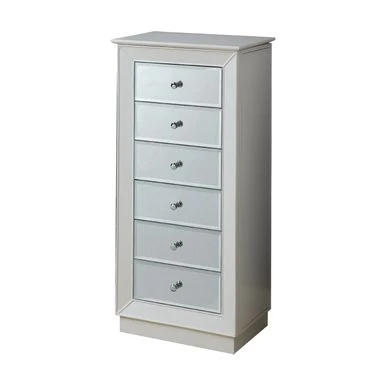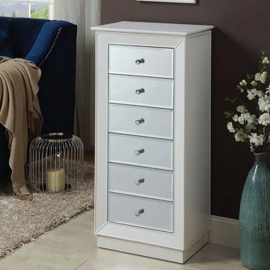 Store your precious jewelry in style with this elegant white Jewelry Armoire, featuring six velvet-lined drawers to neatly organize your bracelets, earrings, rings, and more. The top flips up to reveal a mirror, making it perfect for getting ready in the morning. The sleek and timeless design is sure to complement any home decor.